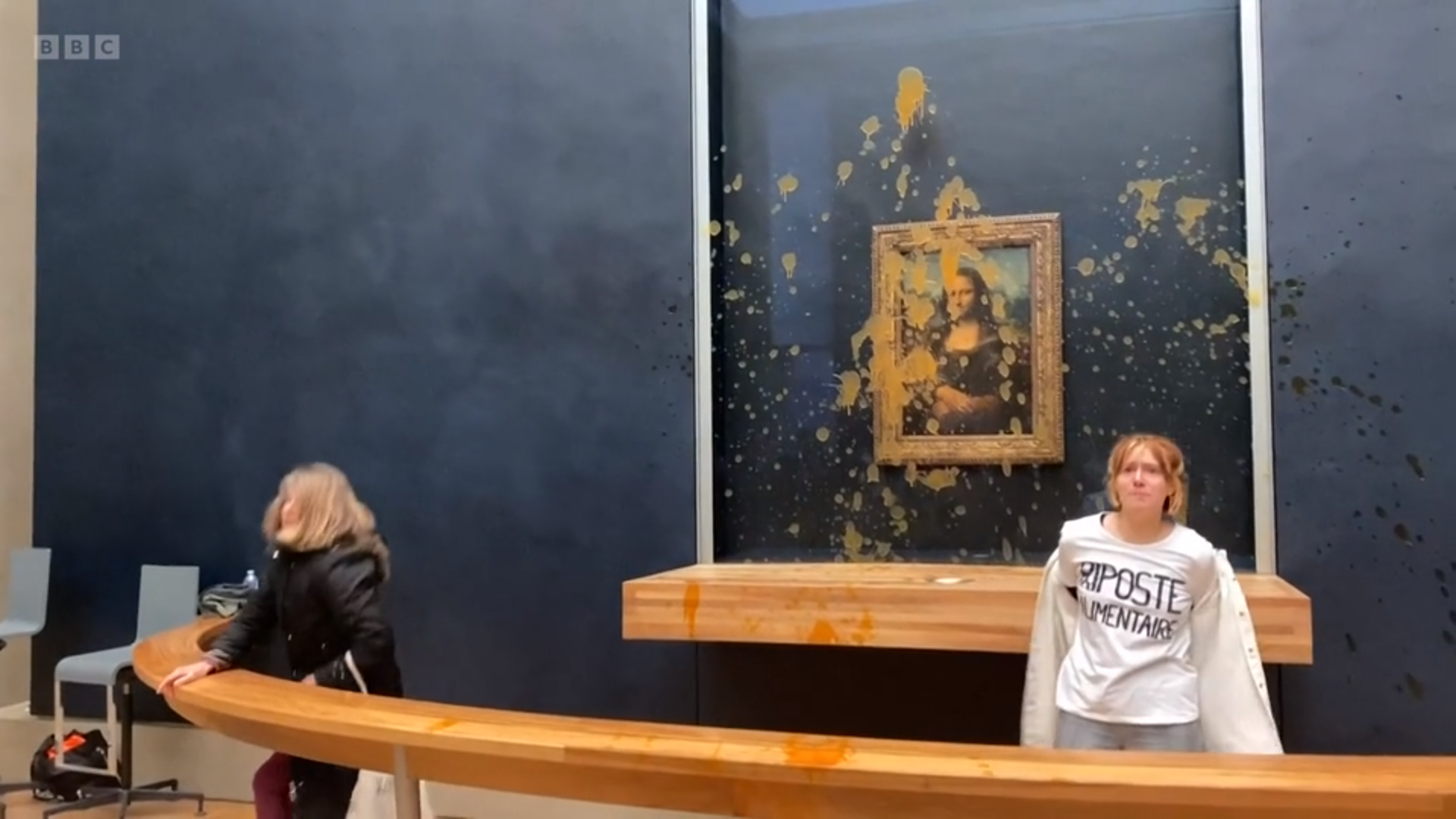 Η μία από τις δύο ακτιβίστριες έβγαλε το σακάκι της για να αποκαλύψει ένα λευκό μπλουζάκι που έφερε με μαύρα γράμματα το σύνθημα της περιβαλλοντικής ακτιβιστικής ομάδας Riposte Alimentaire (Food Response).