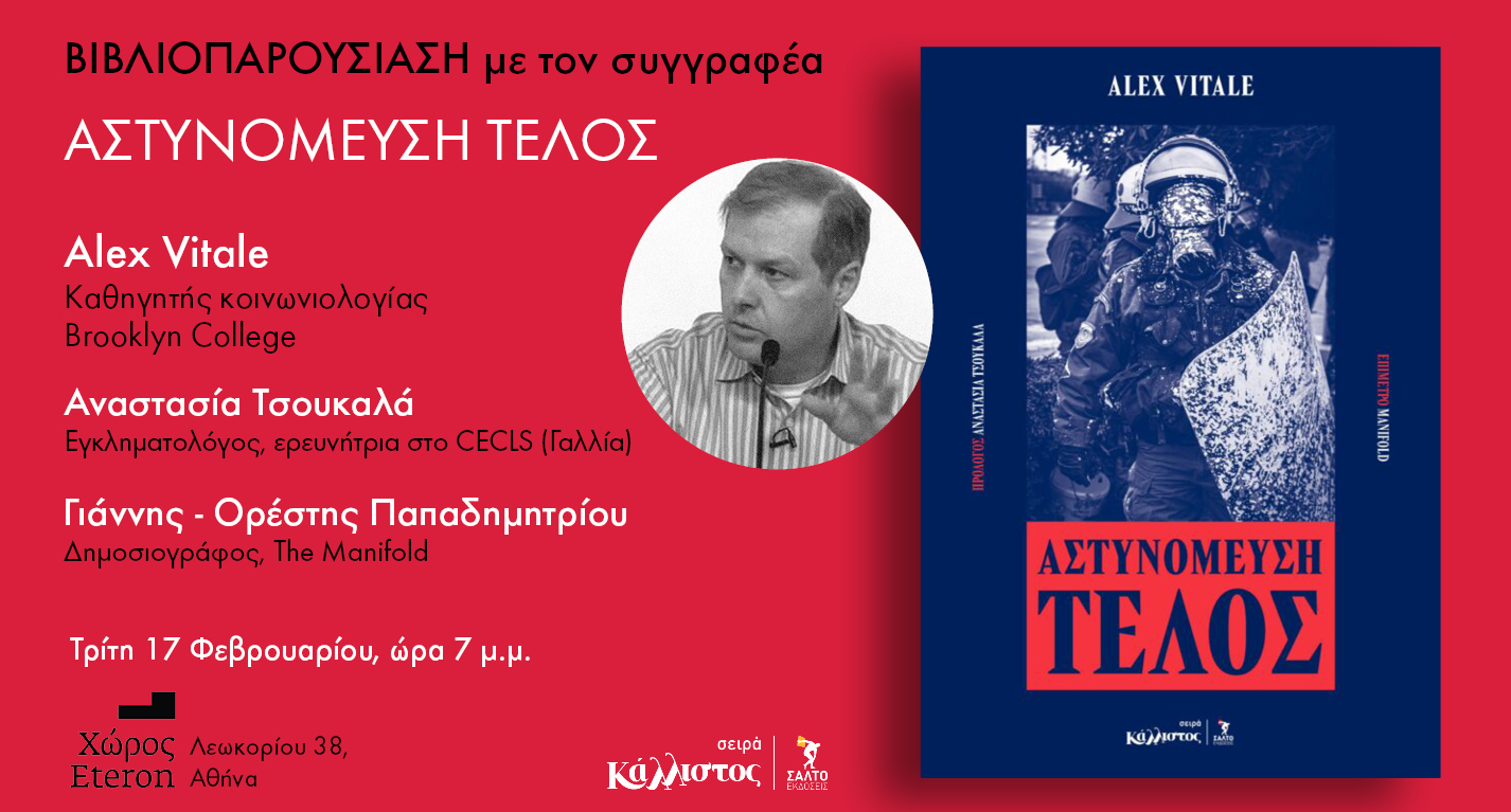 Σήμερα Τρίτη 17 Φεβρουαρίου στις 19.00, στον χώρο Eteron (Λεωκορίου 38, Αθήνα) θα πραγματοποιηθεί η παρουσίαση του βιβλίου «Αστυνόμευση Τέλος» του καθηγητή κοινωνιολογίας στο Brooklyn College, Alex Vitale, που κυκλοφόρησε πρόσφατα από τη σειρά «Κάλλιστος» των εκδόσεων Σαλτο.