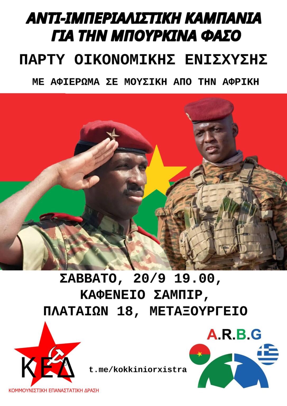 Πάρτι οικονομικής ενίσχυσης θα πραγματοποιήσει η «Αντι-ιμπεριαλιστική Καμπάνια για την Μπουρκίνα Φάσο» σήμερα Σάββατο, μετά τις 7 το απόγευμα, στο καφενείο Σαμπίρ στο Μεταξουργείο.