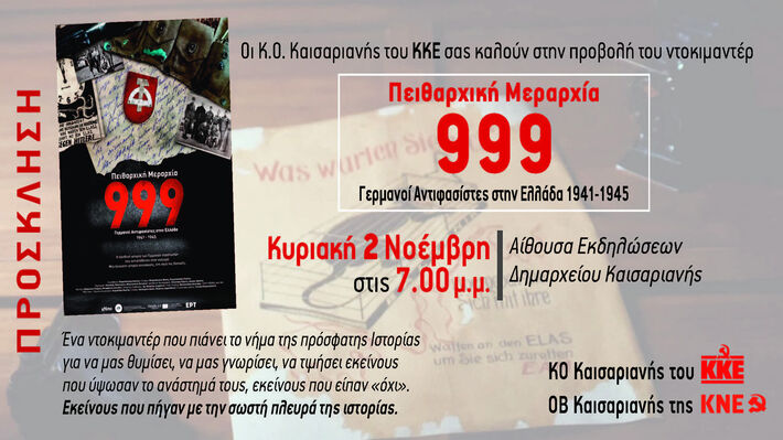 Η προβολή θα πραγματοποιηθεί στην αίθουσα εκδηλώσεων του Δημαρχείου Καισαριανής.