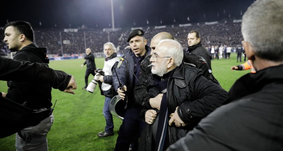Όπως και το φύλλο αγώνα, έτσι και η Έκθεση της Αστυνομίας περιγράφει το γεγονός, σημειώνοντας πως ο μεγαλομέτοχος και πρόεδρος της ΠΑΕ ΠΑΟΚ εισήλθε στο γήπεδο και κινήθηκε προς το κέντρο, παρουσία της προσωπικής του ασφάλειας. Ήταν η στιγμή που ο Ιβάν Σαββίδης ζητούσε από την ομάδα του να αποχωρήσει από το γήπεδο.