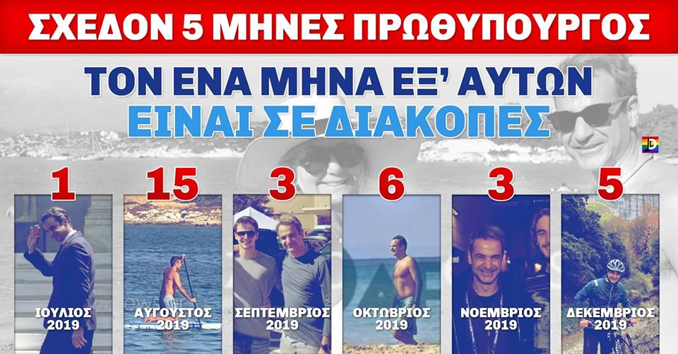Σημειώνεται πως αυτή δεν είναι η πρώτη φορά που ο πρωθυπουργός δράττεται της ευκαιρίας για να κάνει εξορμήσεις στην εξοχή, ενώ από την Δευτέρα, στα κοινωνικά δίκτυα κυκλοφορεί η «έρευνα» του Jodi που μετρά -ούτε λίγο, ούτε πολύ- περί τις 30 ημέρες διακοπών για τον Κ. Μητσοτάκη από την εκλογή.