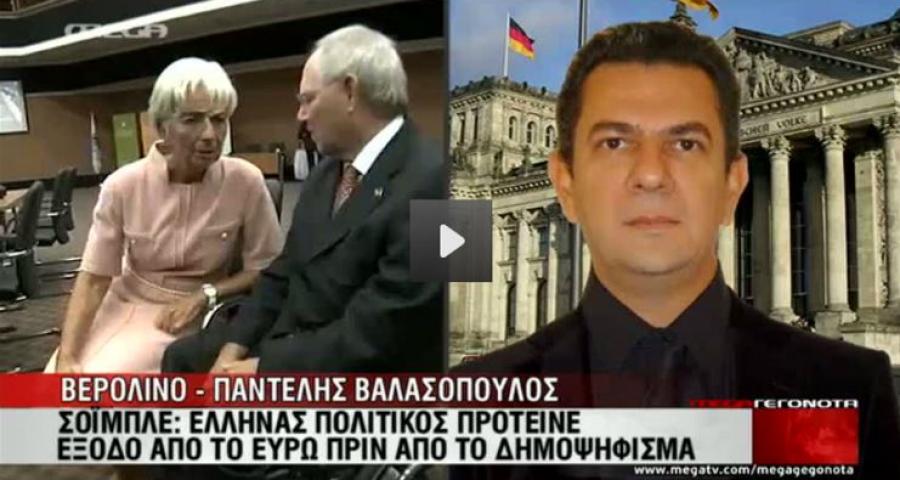 «Όπως μετέδωσε το Mega, ο κ. Σόιμπλε σημείωσε πως η θέση τους ήταν σταθερή, ότι οι Έλληνες υποφέρουν από λάθη και παραλείψεις της ελληνικής ελίτ…Έλληνας πολιτικός, του οποίου τα δημοκρατικά αισθήματα ευθύνης αμφισβητώ, αλλά δεν είναι δική μου δουλειά να αποκαλύψω το όνομά του, πρότεινε να φύγει η Ελλάδα από την ευρωζώνη. Στη συνέχεια έπεσε η ιδέα του δημοψηφίσματος». Σύμφωνα με τον κ. Σόιμπλε ανάλογες προτάσεις του έκαναν και Ιταλοί πολιτικοί. «Υπήρχε στην Ελλάδα το σχέδιο μιας κυβέρνησης να φύγει η Ελλάδα από το ευρώ. Πιστεύετε ότι μια χώρα σαν την Γερμανία δεν θα έπρεπε να κάνει σχέδια για το τι θα γίνει, και σχέδιο Α είχαμε, και σχέδιο Β και Γ και Δ» πρόσθεσε. Τέλος, επανέλαβε ότι η Ελλάδα είναι τώρα σε πολύ καλό δρόμο, με την κατάσταση να είναι πολύ καλύτερη. Επιβεβαίωσε δε ότι στις 11 Ιουνίου θα υποδεχθεί τον Γιάννη Στουρνάρα στο Βερολίνο».
