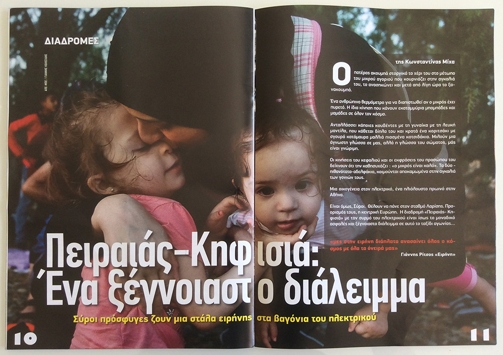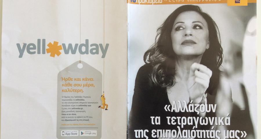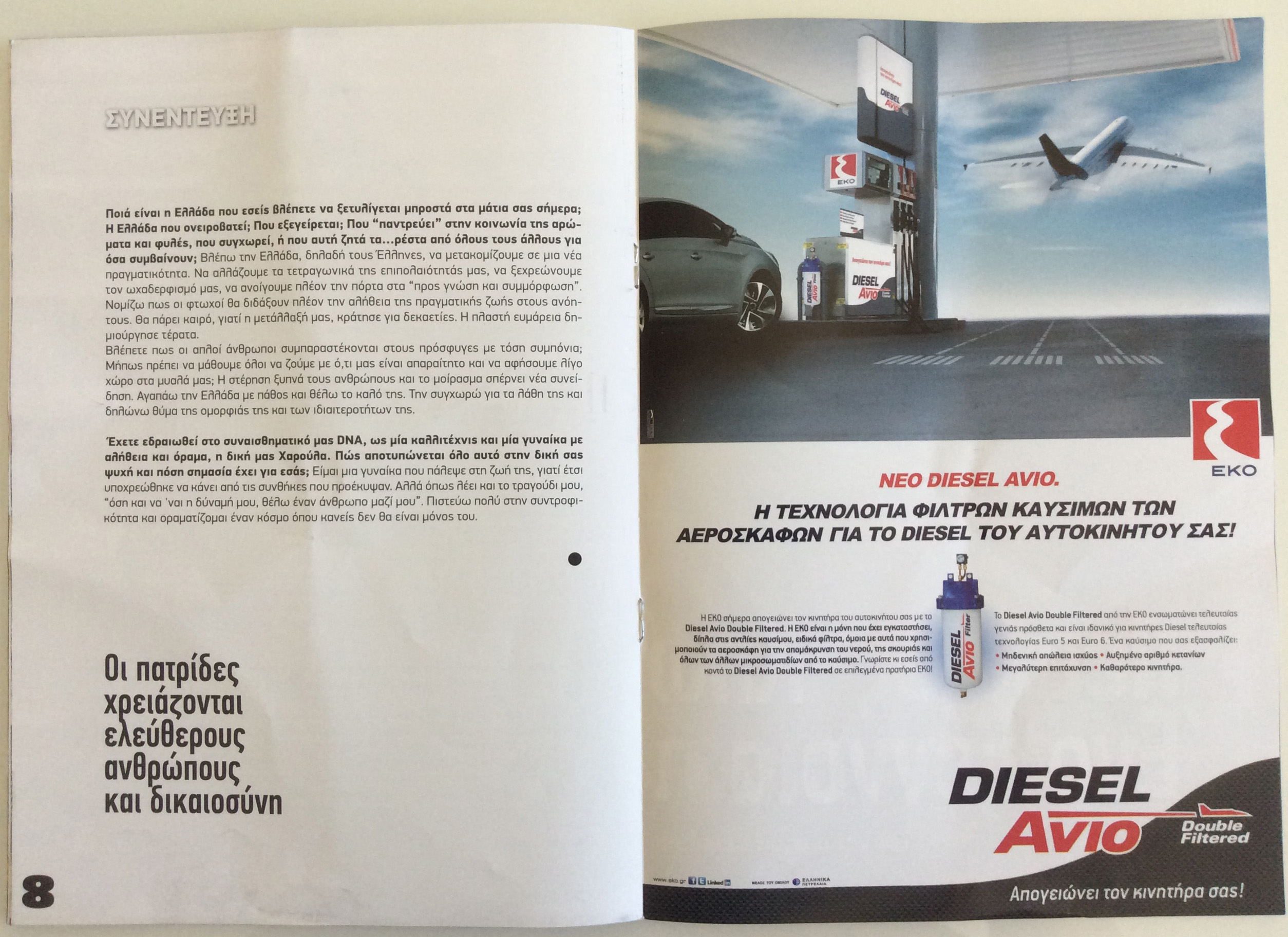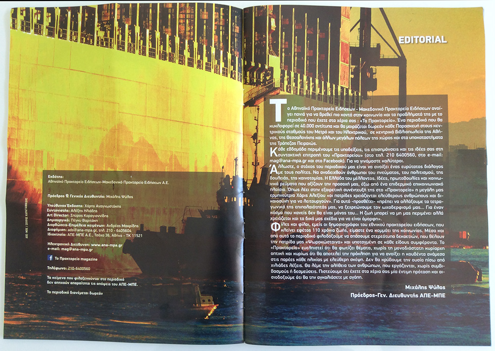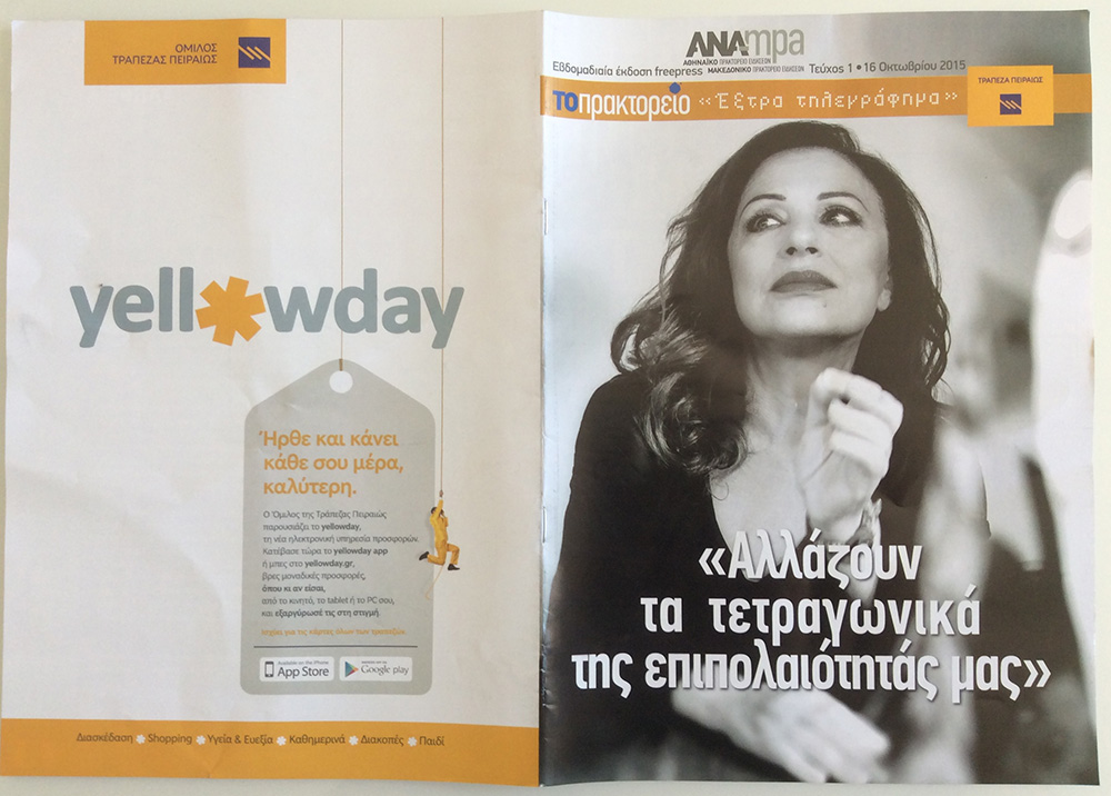 Στο εξώφυλλο / οπισθόφυλλο δεσπόζει η Τράπεζα Πειραιώς. Ας μην σχολιάσουμε ότι η συλλογή εσόδων για το ΑΠΕ γίνεται από μια τράπεζα που έχουν πληρώσει (και θα ξαναπληρώσουν) με βαρύ τίμημα οι πολίτες μέσω των ανακεφαλαιοποιήσεων. Είναι όμως λογικό το λογότυπο της Πειραιώς να βρίσκεται ενσωματωμένο με τους 2 τίτλους του περιοδικού και με το λογότυπο του Αθηναϊκού / Μακεδονικού Πρακτορείου;