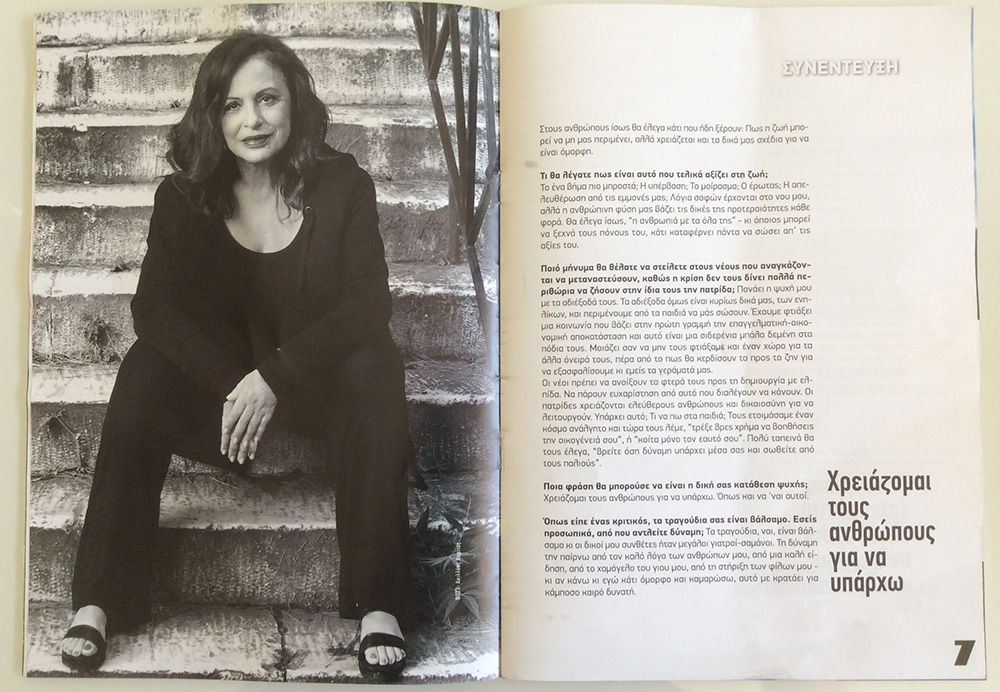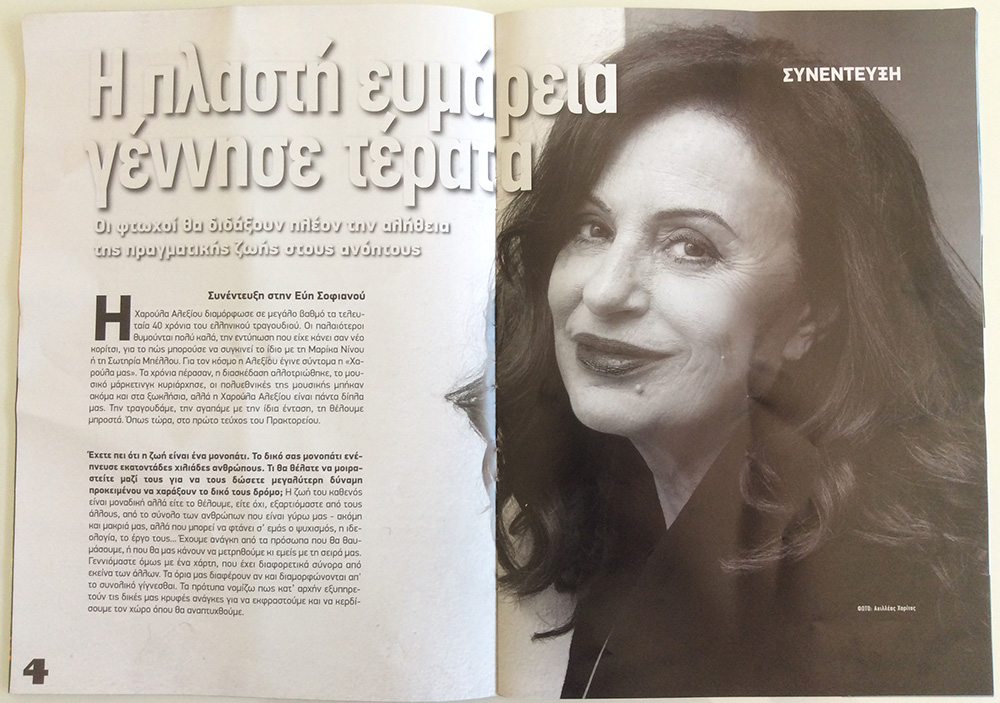 Μετά ξεκινάει η συνέντευξη της Χαρούλας Αλεξίου. Γιατί όχι… Εμείς βέβαια από το πρακτορείο θα περιμέναμε κάποια γεωπολιτική στρατηγική ανάλυση ή κάποιο θέμα ερευνητικό ή έστω διεισδυτικό αλλά αφού έτσι το ήθελε η σύνταξη… ΟΚ. Κι όμως υπάρχει και πάλι πρόβλημα: Η συνέντευξη καταλαμβάνει τις επόμενες 6 σελίδες! με τεράστιες φωτογραφίες, μεγάλα κενά και τεράστια γραμματοσειρά. Η συνολική συνέντευξη σε οποιοδήποτε άλλο περιοδικό θα χωρούσε άνετα σε 2 σελίδες.