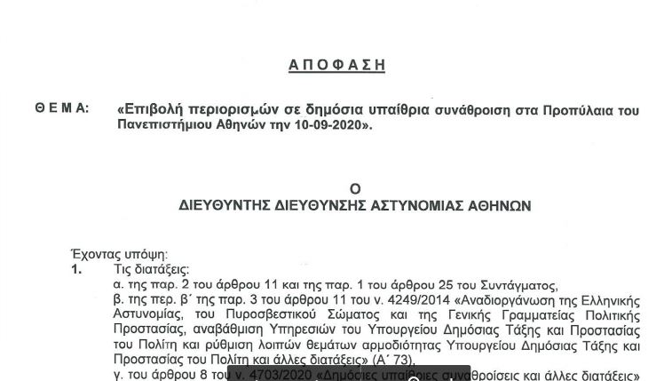 «Ενημερωθήκαμε από την Ελληνική Αστυνομία ότι η πορεία από τα Προπύλαια προς το Μέγαρο Μαξίμου, η οποία έχει προγραμματιστεί για αύριο, Πέμπτη 10 Σεπτεμβρίου, πρέπει να περιοριστεί σε τμήμα του δρόμου. Φαίνεται ότι τα αντανακλαστικά της κυβέρνησης που είναι ανύπαρκτα όταν χρειάζεται να φτιάξει προστατευτικό πλαίσιο για τον Πολιτισμό και να θεσπίσει κανόνες λειτουργίας, ενεργοποιούνται ταχύτατα όταν είναι να καταστείλει την διεκδίκηση των δίκαιων αιτημάτων μας» αναφέρει σε ανακοίνωσή της η Πανελλήνια Ομοσπονδία Θεάματος Ακροάματος και προσθέτει:
