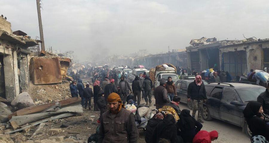 Δεκάδες λεωφορεία που μετέφεραν χιλιάδες ανθρώπους από τη μικροσκοπική ζώνη η οποία παραμένει υπό τον έλεγχο των ανταρτών έφθασαν σε ανταρτοκρατούμενες περιοχές στην ύπαιθρο και δυτικά της πόλης, σύμφωνα με αξιωματούχο των Ηνωμένων Εθνών και το Συριακό Παρατηρητήριο Ανθρωπίνων Δικαιωμάτων, μια μη κυβερνητική οργάνωση που καταγράφει τις εξελίξεις στον πόλεμο στη Συρία.