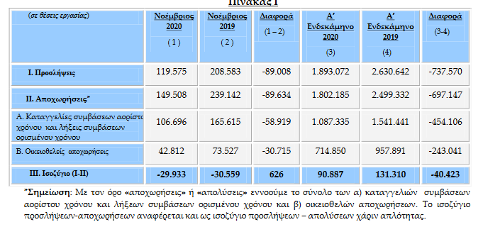 Για τον Νοέμβριο 2020, οι αναγγελίες πρόσληψης ανήλθαν σε 119.575, ενώ οι αποχωρήσεις σε 149.508. Από αυτές, οι 42.812 προήλθαν από οικειοθελείς αποχωρήσεις και οι 106.696 από καταγγελίες συμβάσεων αορίστου χρόνο ή λήξεις συμβάσεων ορισμένου χρόνου.