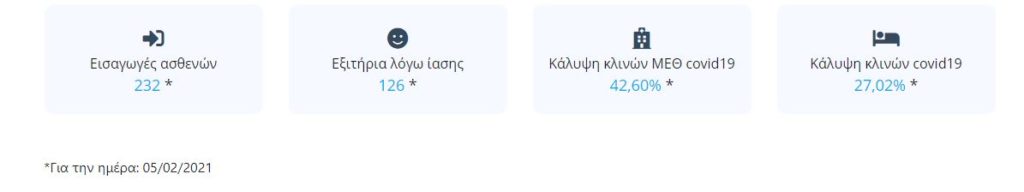 Σύμφωνα με τα στοιχεία του υπουργείου Υγείας, για την Παρασκευή (5/2/2021) οι εισαγωγές ασθενων στα νοσοκομεία ήταν 232, ενώ τα εξιτήρια μόλις 126. Στο ίδιο μήκος κύματος η κάλυψη κλινών ΜΕΘ για Covid φτάνει το 42,60%, ενώ η κάλυψη κλινών covid το 27,02%.