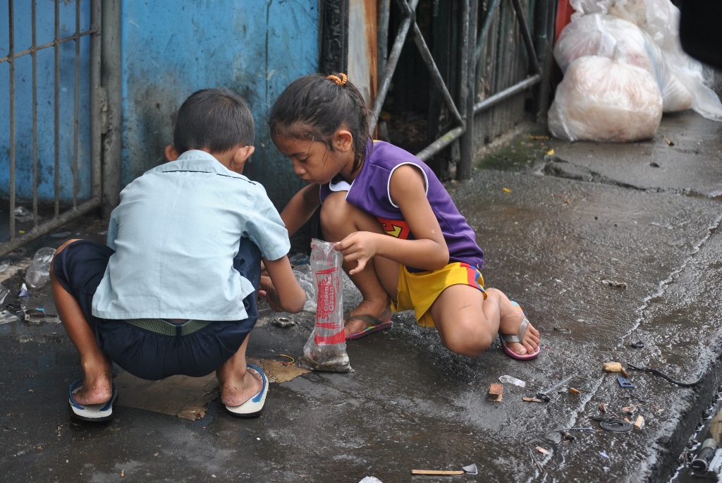 Παιδιά στην πόλη Τάκλομπαν των Φιλιππίνων μαζεύουν καπάκια από μπουκάλια για να τα πουλήσουν (φωτ. Φραγκίσκα Μεγαλούδη)