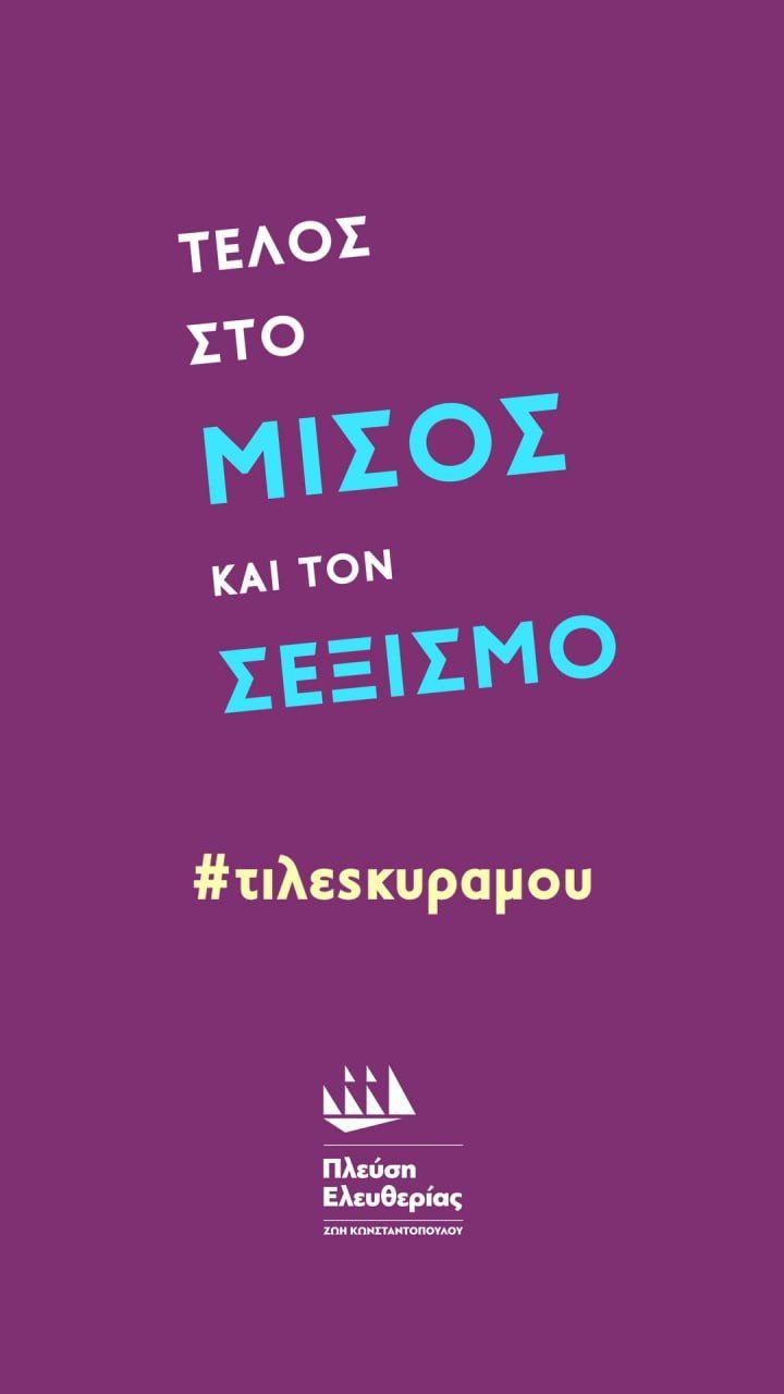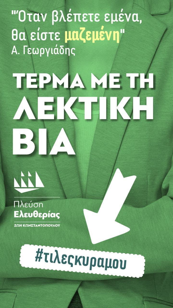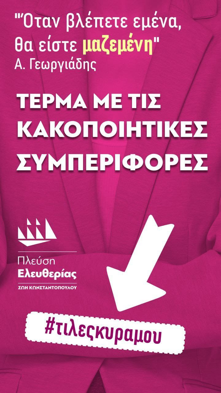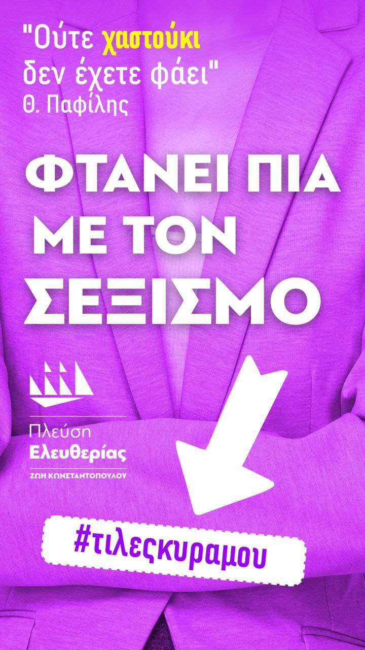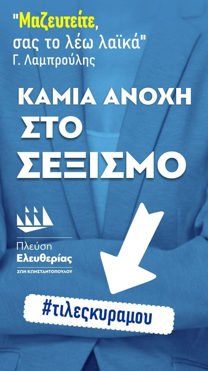 «Η νέα καμπάνια της Πλεύσης Ελευθερίας έχει ξεκινήσει δυναμικά και αποφασιστικά, με πολύχρωμες αφίσες σε όλα τα μέσα κοινωνικής δικτύωσης, που δίνουν το σύνθημα, "Τέλος, Αρκετά, Τέρμα, Όχι στις έμφυλες επιθέσεις και σε αυτούς που τις ανέχονται και δεν τις καταδικάζουν"» σημειώνει στην ανακοίνωσή του το κόμμα, παρουσιάζοντας μία σειρά από σεξιστικά σχόλια που έχει δεχτεί η επικεφαλής του, Ζωή Κωνσταντοπούλου.