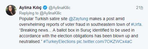 Το πρακτορείο sendika62, έδωσε στη δημοσιότητα βίντεο από τη διαδικασία των τουρκικών εκλογών στο οποίο καταγράφονται πολίτες να βάζουν σωρηδόν φακέλους μέσα σε κάλπη και ύστερα να την σφραγίζουν. Το περιστατικό έλαβε χώρα στην πόλη Altındamla.