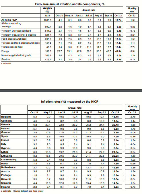 Για το σύνολο των χωρών της Ευρωζώνης προβλέπεται νέα επιτάχυνση των πληθωριστικών πιέσεων, στο 10,7% τον Οκτώβριο, από το 9,9% του Σεπτεμβρίου, σύμφωνα με όσα ανακοίνωσε η στατιστική υπηρεσία της Ευρωπαϊκής Ένωσης. Πρόκειται για ιστορικό υψηλό από τότε που άρχισαν να καταρτίζονται στατιστικά στοιχεία για την ευρωζώνη το 1997.
