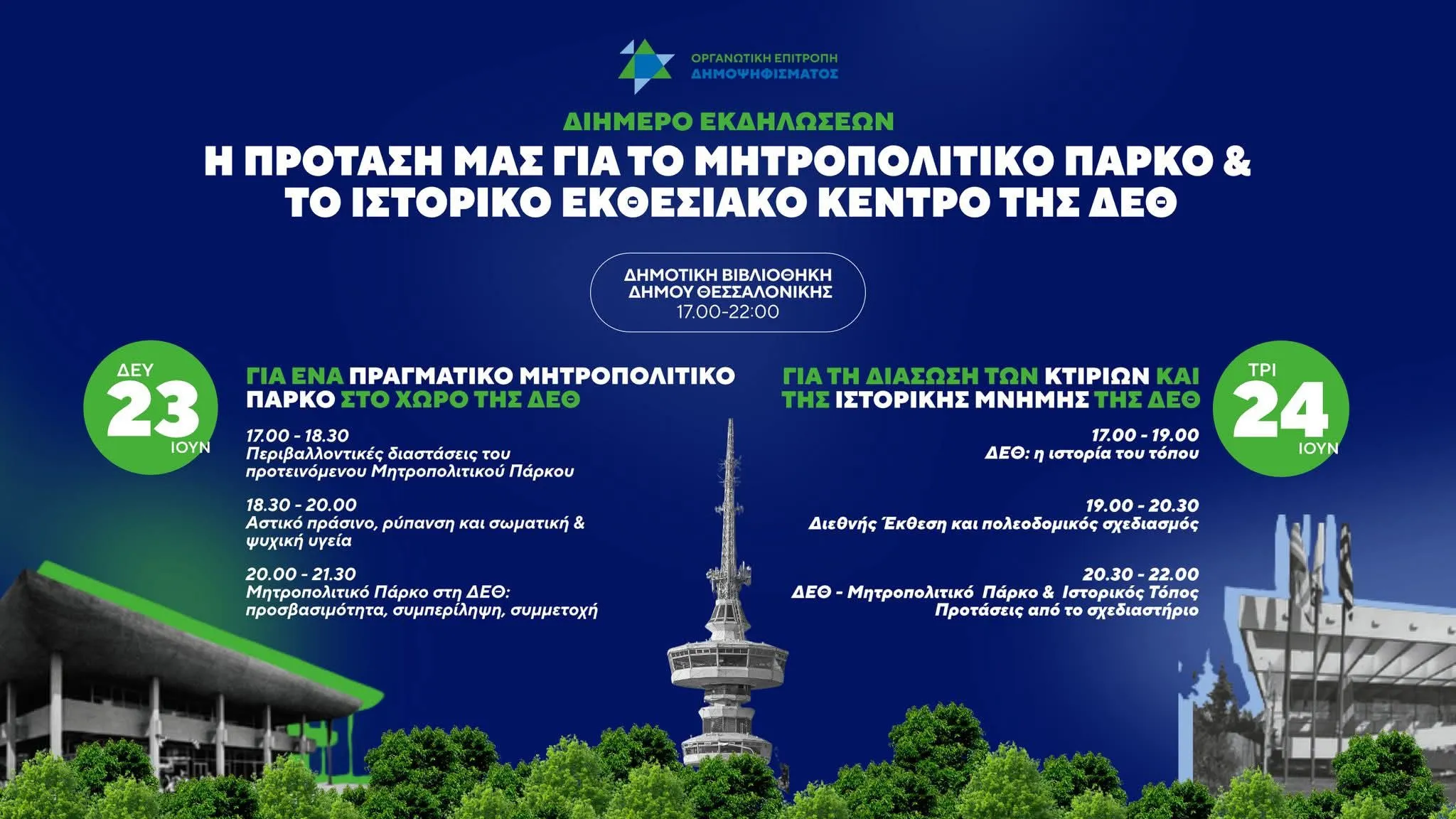 Μετά λοιπόν και τις τελευταίες εξελίξεις, το διήμερο εργαστήρι της Οργανωτικής Επιτροπής Δημοψηφίσματος για τη ΔΕΘ σήμερα και αύριο, 23 και 24 Ιουνίου (17:00 – 22:00, Δημοτική Βιβλιοθήκη Θεσσαλονίκης) έρχεται την κατάλληλη στιγμή για να αναλύσει την ολοκληρωμένη πρότασή μας για το ιστορικό εκθεσιακό κέντρο και να μας δώσει τις αναγκαίες γνώσεις κι επιχειρήματα για τα επόμενα δύο επίδικα: πρώτο, γιατί το πάρκο πρέπει να είναι το μεγαλύτερο δυνατό, χωρίς τα υπόλοιπα τέσσερα μεγαθήρια και το υπόγειο πάρκινγκ, και δεύτερο γιατί πρέπει να διατηρήσουμε τα ιστορικά περίπτερα, αντί να χτίσουμε νέα.