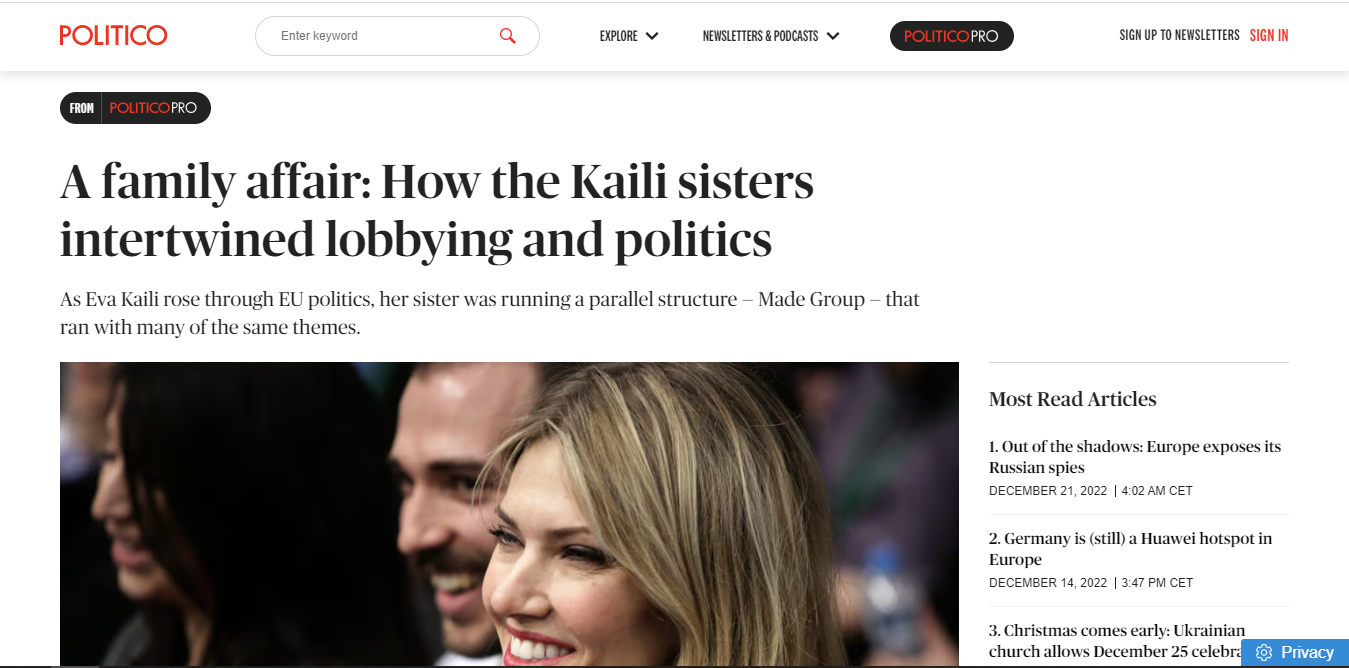 Σε νέο δημοσίευμα του το Politico αναφέρει χαρακτηριστικά πως «καθώς η Εύα Καϊλή, “έχτιζε” καριέρα στο Ευρωπαϊκό Κοινοβούλιο, η αδερφή της, Μανταλένα Καϊλή, ίδρυσε μια οργάνωση, την Made Group, της οποίας η εστίαση συχνά συνέπιπτε με την πολιτική καριέρα της αδελφής της. Όσο πιο ψηλά η Εύα Καϊλή, τόσο η Made Group μεγάλωνε παρασκηνιακά».