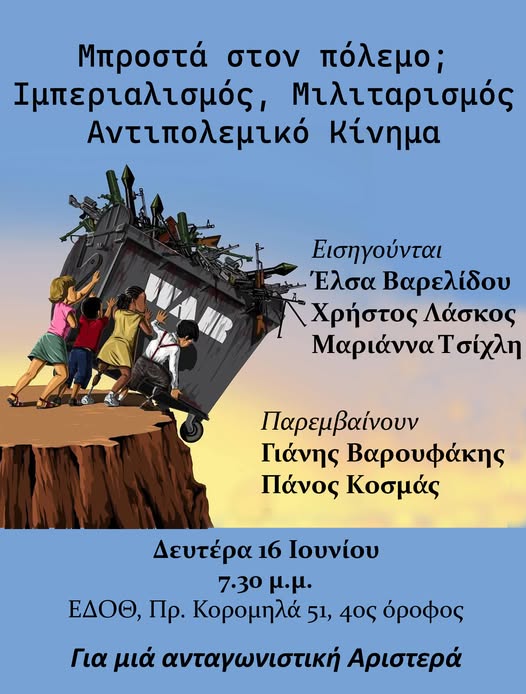 Τη Δευτέρα 16 Ιουνίου, στις 7.30 μ.μ., στην ΕΔΟΘ (Θεσσαλονίκη, Πρ. Κορομηλά 51, 4ος όροφος), η πολιτική ομάδα για μια Ανταγωνιστική Αριστερά οργανώνει εκδήλωση-συζήτηση με τίτλο «Μπροστά στον πόλεμο: Ιμπεριαλισμός, Μιλιταρισμός, Αντιπολεμικό Κίνημα».
