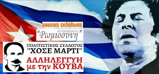 Ο Πολιτιστικός Σύλλογος "Χοσέ Μαρτί" - Αλληλεγγύη με την Κούβα με αφορμή τη επέτειο της Νίκης της Κουβανικής Επανάστασης και της γέννησης του Χοσέ Μαρτί (εθνικού ποιητή και ήρωα της Κούβας), διοργανώνει την Κυριακή 9 Φλεβάρη στις 6 το απόγευμα, στη Νέα Ιωνία, Αττικής Εκδήλωση-Συναυλία με τίτλο: