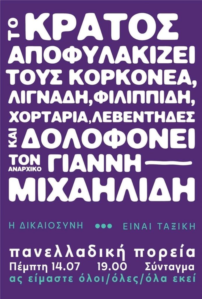 Μεγάλη πορεία αλληλεγγύης στον απεργό πείνας Γιάννη Μιχαηλίδη έχει προγραμματιστεί για σήμερα Πέμπτη, στις 7μμ. (συγκέντρωση στο Σύνταγμα).