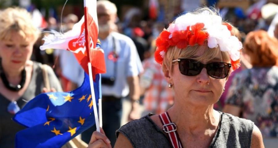 Πολλοί από το πλήθος κρατούσαν σημαίες της Πολωνίας αλλά και της Ευρωπαϊκής Ένωσης.