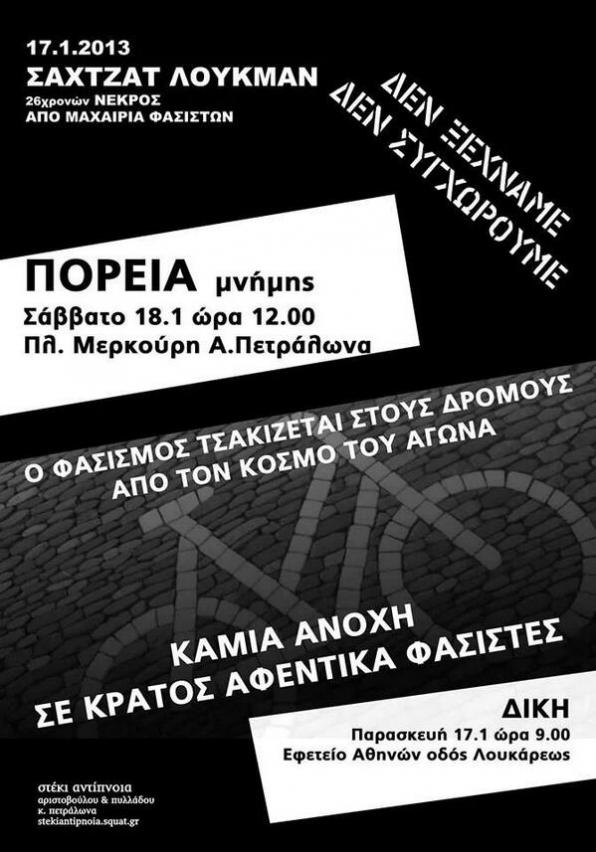 Πορεία μνήμης καλείται στα Άνω Πετράλωνα, το Σάββατο 18/1 και ώρα 12, στην πλατεία Μερκούρης. Στη γειτονιά αυτή, ένα χρόνο πριν, φασίστες δολοφονούσαν με μαχαίρι τον 26χρονο Σαχτζάτ Λουκμάν.