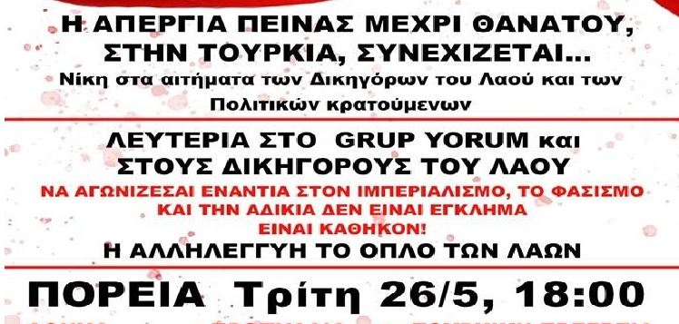 Στη μεγάλη αντίσταση της απεργίας πείνας μέχρι θανάτου, έπεσαν μάρτυρες 3 σύντροφοί μας. H Helin Bölek και ο İbrahim Gökçek , μέλη του επαναστατικού συγκροτήματος Grup Yorum, στη 288η και 323η μέρα αντίστοιχα και ο σύντροφος Mustafa Koçak στη 297η μέρα. Οι σύντροφοι δώσανε τη ζωή τους στον αγώνα για δικαιοσύνη και ελευθερία έκφρασης αντιστεκόμενοι στο φασιστικό καθεστώς του ΑΚΡ, στην καταπίεση και τη φίμωση που αυτό επιβάλλει στους αγωνιστές και τους λαούς της Τουρκίας. Παλέψανε με τρομερή δύναμη ψυχής και ανιδιοτέλεια για τα δίκαια αιτήματα του Grup Yorum και για το σύνολο των αιτημάτων της απεργίας πείνας. Δεν έσκυψαν ποτέ το κεφάλι και δε λύγισαν ούτε για μια στιγμή, αντιστάθηκαν στα βασανιστήρια, στην άγρια καταστολή και στις φυλακίσεις. Αγωνίστηκαν για τους εργαζόμενους, τους νεολαίους και τους λαούς της Τουρκίας, με πίστη και αυταπάρνηση. Γι’αυτό και το καθεστώς Ερντογάν, φοβάται τη δύναμη αυτού του αγώνα και δε δίστασε να επιτεθεί ακόμα και στις κηδείες των μαρτύρων μας, με δακρυγόνα συλλήψεις και βασανιστήρια. Στην πολιτική κηδεία του συντρόφου İbrahim Gökçek, φτάσανε σε σημείο να απαγάγουν το σώμα του, εξαπολύοντας μεγάλη αστυνομική επίθεση, προσαγάγοντας μέχρι και τον πατέρα του.