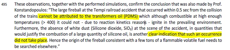 Όπως αναφέρει σε άλλο σημείο το πόρισμα, «οι παρατηρήσεις μαζί με τις προσομοιώσεις που πραγματοποιήθηκαν, οδηγούν τον καθηγητή κ. Κωνσταντόπουλο στο εξής συμπέρασμα: η μεγάλη πυρόσφαιρα στα Τέμπη η οποία ξέσπασε σε 0,5 δευτερόλεπτα από τη σύγκρουση των τρένων, δεν μπορεί από τα έλαια σιλικόνης, τα οποία παρά το ότι μπορούν να είναι εύφλεκτα σε μεγάλης θερμοκρασίες, δεν μπορούν – για λόγους κινητικής αντίδρασης – να αναφλεχθούν στο περιβάλλον που επικρατούσε. Ακόμη, η απουσία λευκής σκόνης (διοξείδιο του πυριτίου) στη σκηνή του δυστυχήματος, σε ποσότητες που θα μπορούσαν να δικαιολογήσουν την ανάφλεξη μεγάλης ποσότητας ελαίων σιλικόνης, είναι ακόμη άλλη μία ξεκάθαρη απόδειξη ότι τέτοιο περιστατικό δε συνέβη. Ως εκ τούτου, η προέλευση της πυρόσφαιρας με μερικούς τόνους εύφλεκτων πτητικών καυσίμων πρέπει να αναζητηθεί αλλού.