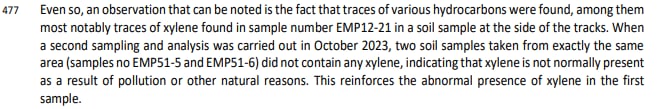 Όπως διαβάζουμε χαρακτηριστικά στο πόρισμα «εντοπίστηκαν ίχνη από διάφορους υδρογονάνθρακες, μεταξύ αυτόν το ξυλόλιο (…) σε δείγμα εδάφους δίπλα στους τροχούς», ενώ σημειώνουν ότι σε δεύτερο χρόνο, και συγκεκριμένα τον Οκτώβριο του 2023, πάρθηκαν δύο δείγματα εδάφους από ακριβώς την ίδια περιοχή, στα οποία δεν υπήρχε κανένα ίχνος ξυλολίου, καταλήγοντας ότι «το ξυλόλιο δεν υπάρχει συνήθως ως αποτέλεσμα της μόλυνσης ή άλλου φυσικού λόγου. «Αυτό επιβεβαιώνει τη μη φυσιολογική παρουσία ξυλολίου στο πρώτο δείγμα».