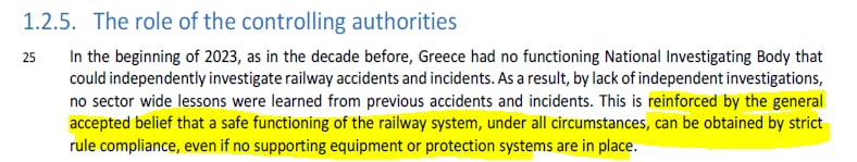 Στο πόρισμα αναφέρεται ότι στις αρχές του 2023, όπως και μία δεκαετία πριν, η Ελλάδα δεν είχε κανένα λειτουργικό Εθνικό Όργανο Έρευνας το οποίο θα μπορούσε ανεξάρτητα να ερευνά περιστατικά και ατυχήματα στον σιδηρόδρομο. Αποτέλεσμα της έλλειψης ανεξάρτητων ερευνών, ήταν το να μην αντληθούν διδάγματα σε ολόκληρο τον κλάδο από προηγούμενα ατυχήματα ή περιστατικά. Αυτό ενισχύεται ακόμη περισσότερο και από την πεποίθηση κοινής παραδοχής ότι ένας λειτουργικός και ασφαλής σιδηρόδρομος μπορεί να διατηρηθεί απλώς και μόνο με τη συμμόρφωση στον κανονισμό, ακόμη και αν δεν είχε τοποθετηθεί ο εξοπλισμός υποστήριξης, ή των συστημάτων ασφαλείας.