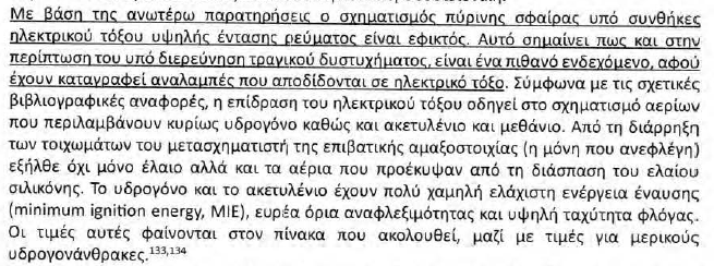 Στη συνέχεια κάνει αναφορά στο πόρισμα του ΕΟΔΑΣΑΑΜ, «που έχει διευρευνήσει διεξοδικά το τραγικό συμβάν, καταγράφηκαν στα βίντεο 3 έντονες αναλαμπές που χαρακτηρίζονται ως ηλεκτρικό τόξο […]. Με βάση τις ανωτέρω παρατηρήσεις ο σχηματισμός πύρινης σφαίρας υπό συνθήκες ηλεκτρικού τόξου υψηλής έντασης ρεύματος είναι εφικτός. Αυτό σημαίνει πως και στην περίπτωση του υπό διερεύνηση τραγικού δυστυχήματος , είναι ένα πιθανό ενδεχόμενο, αφού έχουν καταγραφεί αναλαμπές που αποδίδονται σε ηλεκτρικό τόξο».