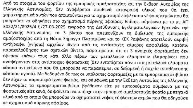 «Από τα στοιχεία του φορτίου της εμπορικής αμαξοστοιχίας και την Έκθεση Αυτοψίας της Ελληνικής Αστυνομίας, δεν αναφέρεται πουθενά καταγραφή υλικού που θα έχει χαρακτηριστικά αυτών που απαιτούνται για το σχηματισμό εύφλεκτου νέφους ατμών που θα μπορούσε να οδηγήσει στο σχηματισμό πύρινης σφαίρας. Επίσης, σύμφωνα με το με ΑΠ 3022/21/8925/4-ζ΄/27-03-2025 έγγραφο της Διεύθυνσης Εγκληματολογικών Ερευνών της Ελληνικής Αστυνομίας, τα 3 βίντεο που απεικονίζουν τη διέλευση της εμπορικής αμαξοστοιχίας από τη Νότια Σήραγγα Πλαταμώνα και το ΚΕΚ Ραψάνης αποτελούν ακριβή αντίγραφα (γνήσια) αρχείων βίντεο από τις αντίστοιχες κάμερες ασφαλείας. Κατόπιν παρακολούθησης των σχετικών βίντεο, παρατηρείται ότι οι 3 ανοιχτές φορτάμαξες δεν έφεραν επάνω τους κάτι άλλο πέραν των μεταλλικών ελασμάτων (λαμαρίνες) που αναφέρονταν στις αντίστοιχες φορτωτικές (δεν εντοπίζεται πάνω στα μεταλλικά ελάσματα κάποιο αντικείμενο που θα μπορούσε να παραπέμπει σε δεξαμενή ή δοχεία αποθήκευσης κάποιου υγρού). Με δεδομένο δε πως οι υπόλοιπες φορτάμαξες με τα εμπορευματοκιβώτια δεν είχαν το παραμικρό ίχνος φωτιάς, και σύμφωνα με την Έκθεση Αυτοψίας της Ελληνικής Αστυνομίας τα εμπορευματοκιβώτια βρέθηκαν είτε με εμπορεύματα σύμφωνα με τις φορτωτικές είτε κενά, δε φαίνεται να υπήρχε στην εμπορική αμαξοστοιχία φορτίο με πτητικό υλικό από το οποίο θα μπορούσε να σχηματιστεί νέφος εύφλεκτων ατμών που θα οδηγούσε σε σχηματισμό πύρινης σφαίρας».