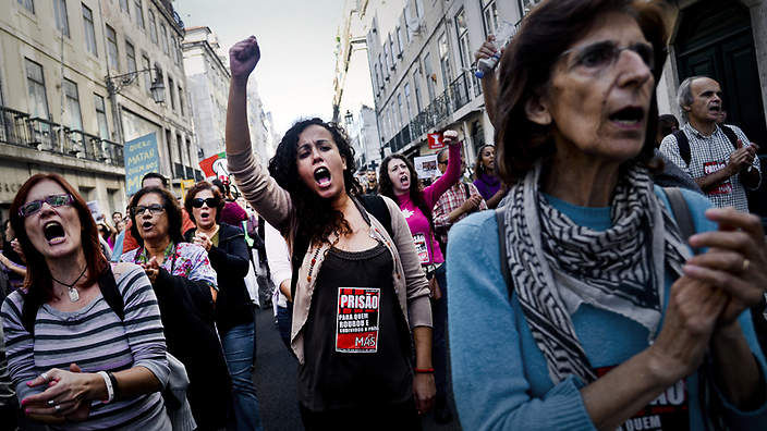 «Κυβέρνηση εκτός νόμου», «ο προϋπολογισμός είναι ληστεία» και «αρκετά τρόικα», ήταν ορισμένα από τα συνθήματα που είχαν γράψει στα πανό οι διαδηλωτές, που βγήκαν στους δρόμους ανταποκρινόμενοι σε κάλεσμα του μεγαλύτερου συνδικάτου της Πορτγαλίας, του CGTP.