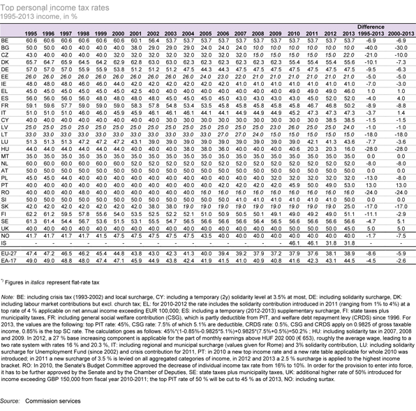 Σύμφωνα με τα στοιχεία που δημοσίευσε πρόσφατα η Ευρωπαϊκή Επιτροπή, ο ανώτατος φορολογικός συντελεστής στην Ελλάδα για τα εισοδήματα του 2013 είναι 46% (συνυπολογίζει και την έκτακτη εισφορά αλλληλεγγύης 1-4%, η οποία στο ανώτατο όριο 4% εφαρμόζεται για ποσά άνω των 100.000 ευρώ). Μάλιστα είναι μειωμένος έναντι του 49% των προηγούμενων τριών ετών 2010, 2011 και 2012!