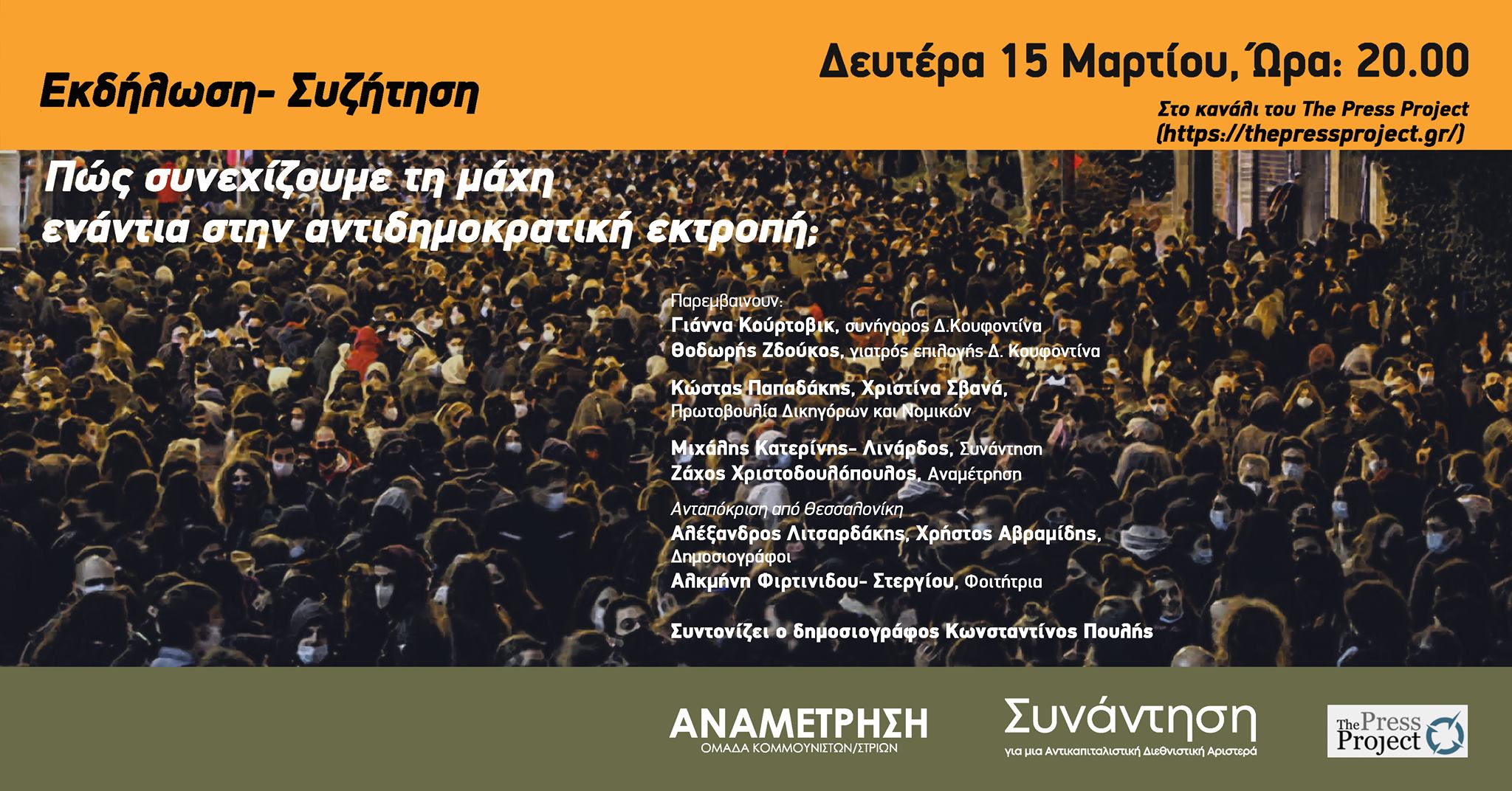 Το The Press Project θα φιλοξενήσει και θα μεταδώσει ζωντανά, τη Δευτέρα 15 Μαρτίου στις 20:00, εκδήλωση – συζήτηση με το επίκαιρο θέμα «Πώς συνεχίζουμε τη μάχη ενάντια στην αντιδημοκρατική εκτροπή;», στην οποία θα συμμετέχουν η δικηγόρος Ιωάννα Κούρτοβικ, ο γιατρός Θοδωρής Σδούκος, οι δικηγόροι, από την Πρωτοβουλία Δικηγόρων και Νομικών Κώστας Παπαδάκης και Χριστίνα Σβανά, ενώ ανταποκρίσεις θα δώσουν, από τη Θεσσαλονίκη, οι δημοσιογράφοι Αλέξανδρος Λιτσαρδάκης και Χρήστος Αβραμίδης, και η φοιτήτρια Αλκμήνη Φιρτινίδου- Στεργίου. Εκ των διοργανωτών συμμετέχουν οι Μιχάλης Κατερίνης- Λινάρδος και Ζάχος Χριστοδουλόπουλος.