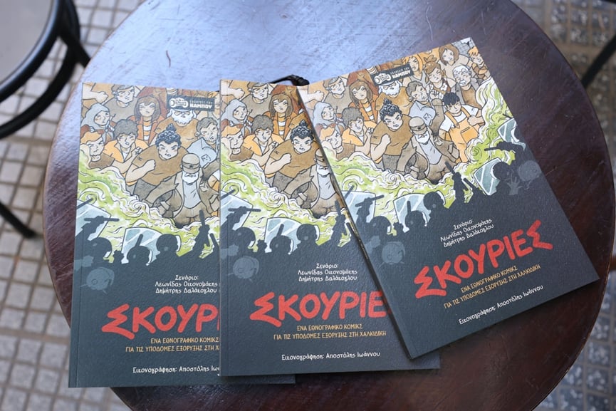 Όπως και σε κάθε σπουδαίο έργο, χρειάστηκε η σύμπραξη των κατάλληλων ανθρώπων την κατάλληλη στιγμή, και έτσι η εθνογραφική έρευνα του Λεωνίδα Οικονομάκη κατάφερε να ξεφύγει από τα ακαδημαϊκά στεγανά και να μεταφερθεί με αμεσότητα σε μια «εθνογραφική νουβέλα», όπως ονομάζουν το κόμικς «Σκουριές: Ένα εθνογραφικό κόμικς για τις υποδομές εξόρυξης στη Χαλκιδική» οι συντελεστές του. Το TPP συνάντησε τους συντελεστές του κόμικς κατά τη διάρκεια της παρουσίασης του έργου τους στο βιβλιοπωλείο «Ακυβέρνητες Πολιτείες» στη Θεσσαλονίκη, μια εκδήλωση που έλαβε χώρα στο πλαίσιο της «Εβδομάδας Μικρών Βιβλιοπωλείων», στην οποία παρευρέθηκαν και οι πάντα συγκλονιστικοί Χαλκιδικιώτες αγωνιστές από το χωριό Μεγάλη Παναγιά, τον τόπο όπου διαδραματίζεται το κόμικς.