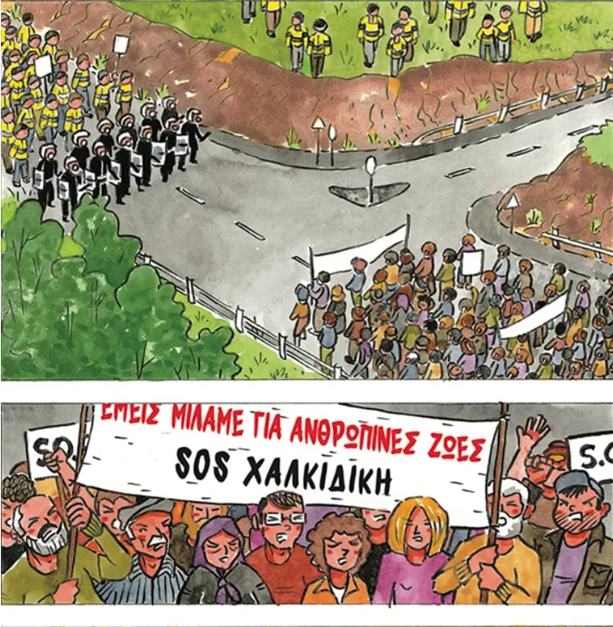 Λ.Ο.: Είναι ένας μικρός τόπος αλλά το ζήτημα είναι μεγάλο. Ακόμα και στο κόμικς που φτιάξαμε, προσθέσαμε μέσα το κίνημα των μεταλλωρύχων -δηλαδή, ας πούμε της αντίπαλης πλευράς- έτσι όπως έλαβε χώρα τις προηγούμενες δεκαετίες. Το 1977 έχουμε τις μεγάλες απεργίες όπου οι εργαζόμενοι μεταλλωρύχοι διεκδικούσαν καλύτερες συνθήκες εργασίας, δηλαδή να μην πεθαίνουν από πνευμονοκονίαση. Στα Μαντεμοχώρια έχουμε εισβολή της χωροφυλακής σε ορισμένες περιοχές στην προσπάθεια να καταστείλουν την απεργία, αντίστοιχες καταστάσεις που έζησε το αντιεξορυκτικό κίνημα πρόσφατα. Είναι αρκετά ενδιαφέρον το πως αυτό άλλαξε στην περίπτωση των Σκουριών, όπου όσοι συνεργάζονταν με τις εταιρείες είχαν ως σύνθημα «Πρώτα η δουλειά και μετά η υγεία». Η οικονομική κρίση σίγουρα συνέβαλε σε αυτή την κατεύθυνση.