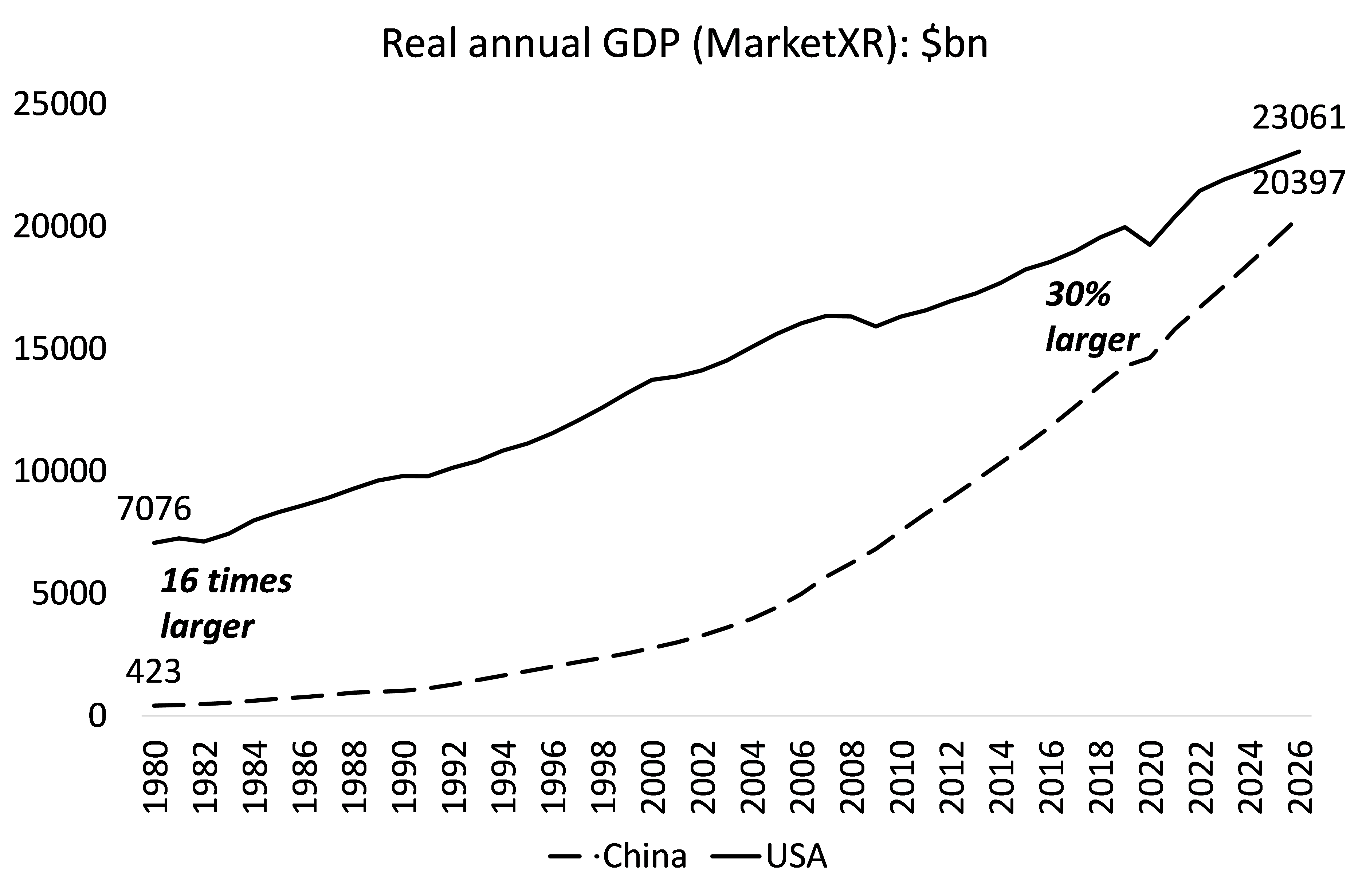 Όπως φαίνεται στο παρακάτω διάγραμμα, το πραγματικό ΑΕΠ της Κίνας υπολείπεται ελάχιστα αυτού των ΗΠΑ, ενώ το 1980 αποτελούσε μόλις το 6% του αμερικανικού. Σε μονάδες αγοραστικής δύναμης το κινεζικό ΑΕΠ είναι περίπου 25% μεγαλύτερο από εκείνο των ΗΠΑ. Αξίζει, επίσης, να σημειωθεί πως η εκρηκτική μεγέθυνση της Κίνας προηγείται των μεταρρυθμίσεων της δεκαετίας του ’80. Από το 1950 έως το 1978, στη «μαοϊκή περίοδο», με όλα τα καταστροφικά διαστήματα του Μεγάλου Άλματος και της Πολιτιστικής Επανάστασης, η οικονομία μεγεθύνονταν με ρυθμό περίπου 7% σε πραγματικούς όρους!