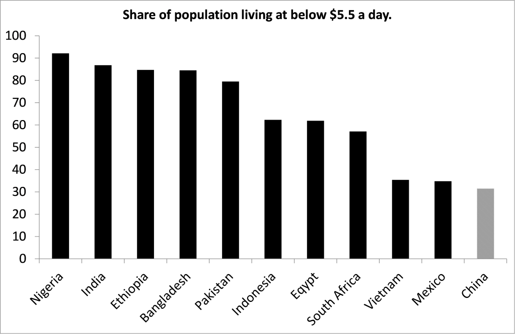 Θα πρέπει να σημειωθεί, βέβαια, ότι οι ανισότητες, οι οποίες αυξήθηκαν μετά από την επικράτηση του Ντενγκ το 1978 και την οικονομική «φιλελευθεροποίηση», είναι μεγάλες. Βάσει του δείκτη Gini, όπου η τιμή 1 σημαίνει απόλυτη ανισότητα, ενώ το 0 απόλυτη ισότητα, η Κίνα βρίσκεται σε μια ενδιάμεση θέση. Η εισοδηματική ανισότητα, η οποία κατά βάση αντανακλά γεωγραφικές αποκλίσεις, είναι μεγάλη (Gini =0.45). Στις άλλες BRICS ο δείκτης προσεγγίζει το 0.6 και στο Βορρά είναι κάτω από το 0.4.