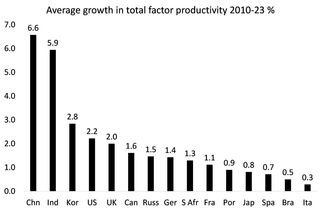 Σύμφωνα με το US Conference Board, η Κίνα παρουσίασε την τελευταία δεκαετία ρυθμό αύξησης της TFP τριπλάσιο από τις ΗΠΑ, πενταπλάσιο από τη Γερμανία και οκταπλάσιο από την Ιαπωνία.
