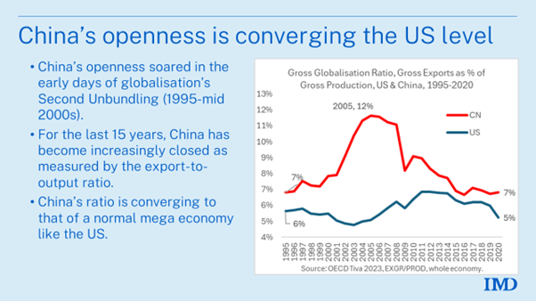 Ο δείκτης ακαθάριστες εξαγωγές προς ακαθάριστη παραγωγή βρίσκεται στο 7%, ενώ για τις ΗΠΑ είναι 5%. Γι’ αυτό και το IMD δίνει στο γράφημα τον τίτλο: Ως προς την ανοιχτότητα της οικονομίας, η Κίνα συγκλίνει με τις ΗΠΑ.