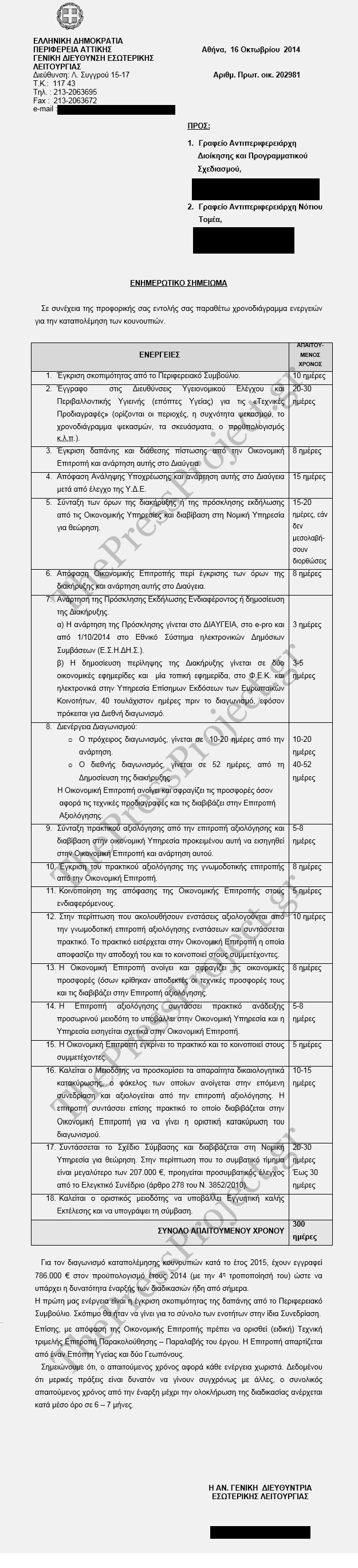 Η κωλυσιεργία πάντως εμφανίζεται σχεδόν σε όλα τα βήματα της διαδικασίας, όπως για παράδειγμα ότι για το άνοιγμα των προσφορών και την επανασφράγισή τους ζητούνται 8 ημέρες (θα έχουν πολύ αργό σελοτέιπ) ή σε άλλη περίπτωση η επιτροπή αξιολόγησης χρειάζεται 8 ημέρες για να συντάξει την εισήγησή της και άλλες 5 ημέρες για να την εγκρίνει (θα κάνουν πολλές διορθώσεις στα ορθογραφικά λάθη).