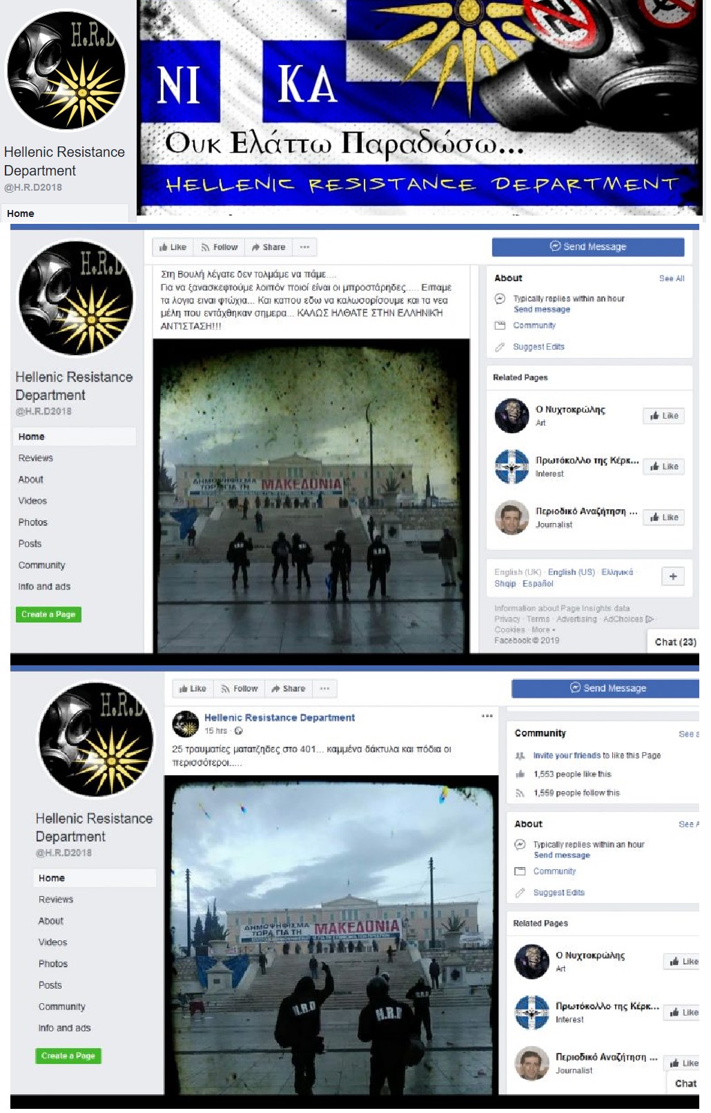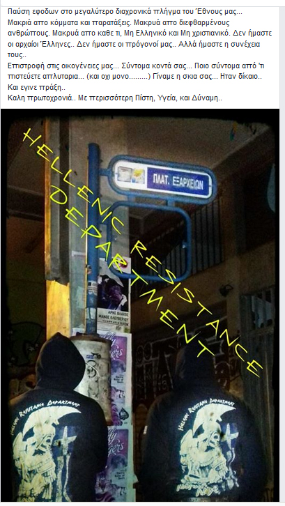 H εν λόγω ομάδα αυτοπροσδιορίζεται ως «Hellenic Resistance Department» και διατηρεί σελίδα «κοινότητας» στο Facebook, στην οποία και δημοσίευσε φωτογραφίες από την παρουσία μελών της στην πλατεία Συντάγματος.