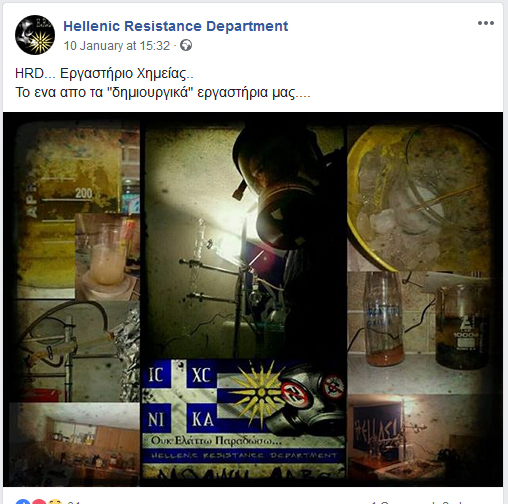 Ακόμα πιο χαρακτηριστική για τον εξτρεμιστικό χαρακτήρα της είναι μια σύνθεση φωτογραφιών που η εν λόγω ομάδα έχει δημοσιεύσει και οι οποίες απεικονίζουν εργαστήριο με αντιδραστήρια, δοχεία και εργαστηριακό εξοπλισμό, ο οποίος παραπέμπει σε κατασκευή εκρηκτικών ουσιών και συνοδεύεται από το σχόλιο: