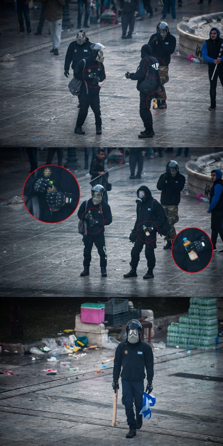 Τα άτομα αυτά εμφανίστηκαν από νωρίς στην Πλατεία Συντάγματος με τα διακριτικά HRD στα μπουφάν τους, μαύρα κράνη, μαύρα στρατιωτικά παντελόνια, σακίδια αλλά και ίδιου τύπου μεταξύ τους αντιασφυξιογόνες μάσκες. Μαρτυρίες που έχουμε στη διάθεσή μας τοποθετούν χρονικά την αποχώρηση της ομάδας από τον χώρο των επεισοδίων, μέσω του σταθμού μετρό Μοναστηράκι, αργά το απόγευμα.