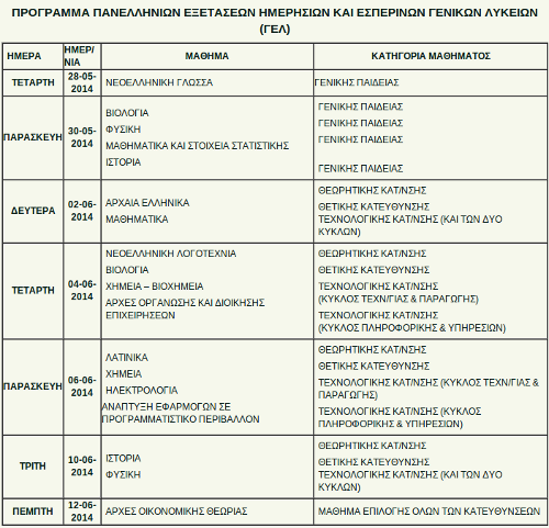 Το πρόγραμμα των πανελλαδικών εξετάσεων Ημερήσιων και Εσπερινών Γενικών Λυκείων 2014