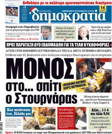 DIMOKRATIAStournaras: Home aloneNew Democracy’s Parliamentary Team under stress after Polydoras’s bomb. 41 MPs attack heartless Finance Minister about heating oil. Blood transfusions carried out wearing…jackets in Athens Childern Hospital. *Context: Vyron Polydoras, a long-standing New Democracy MP, was kicked out of the party after voting down the new real estate tax on Saturday |