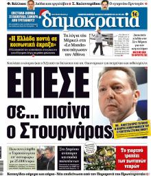 DIMOKRATIAYiannis Stournaras falls into… a swimming pool!The Finance Minister’s recent comments regarding heating oil and the smog problem provoke angry reactions from many, including ND MPs. His sidelining is currently being discussed in the prime minister’s mansion. Panicked, the heartless technocrat disputes something that is not up to him to decide. |