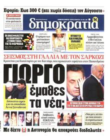 DIMOKRATIAGeorge, did you hear the news? An earthquake in France with Sarkozy – he is being held for his dealings with Gaddafi which is causing nightmares for Papandreou. Anxiety in Athens as well about what the investigation in Paris will uncover |