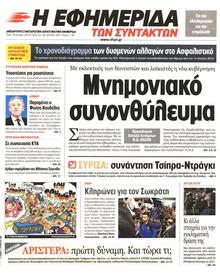 EFIMERIDA TON SYNTAKTONA pro-memorandum mish-mash The coalition government is attempting to throw sand in the people’s eyes with the new makeup of the cabinet. With its eye on future elections and after 2 weeks of bargaining, the crucial ministerial positions have been taken on by people who enjoy the full trust of the lenders – such as the new Finance Minister Gkikas Hardouvelis who guarantees the strict implementation of austerity. The pre-election character of the new administration is confirmed by the stronger presence of the populist right which has the aim of appealing to conservative voters who abandoned New Democracy. |