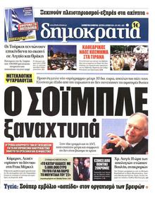 DIMOKRATIA (Monday)Schauble strikes again He pre-announces a new ‘programme’ with a loan of up to 10 billion euros, threatening the again Greeks with an exit from the eurozone if they do not continue the harsh sacrifices. The troika rejects a proposal for the number of installments to be increased for outstanding taxes! A hair-raising package of labour and social security reforms. The IMF is aligned asking for further measures and agreeing that the debt is not sustainable. |