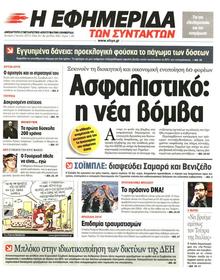 EFIMERIDA TON SYNTAKTON (Monday)Social Security: A new bomb The administrative and financial unification of 60 bodies is beginning The fuse of the bomb of social security rights has been lit by the Ministry of Labour and Social Security with the signing of a contract with the Center of Planning and Economic Research for a study whose purpose is the administrative and financial unification of social security funds. In effect in amounts to opening discussions in the country with regards to changes the government has already agreed to. These include the elimination of early retirement, an increase in the years of insurance required for a full pension, a unification of the Funds (with the goal of 2017 a basic pension for all worth 360 euros) and a reduction in pensions. |